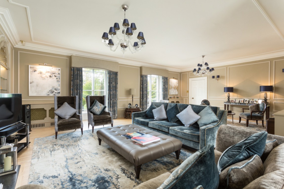 To the other side of the orangery, to the north of the main house is an adjoining annexe with additional living space to support the main house. There is a sizeable sitting area with bespoke sweeping staircase leading up to a cinema room, a further sitting room, games room, kitchen/ dining room and two bedrooms beneath (one en suite) as well as a separate bathroom. The cinema room has built in Lutron controlled black out blinds and a wall mounted projector supported by an Artcoustic surround system giving a real cinematic experience. This part of the house also has access to the double garage, a storage room, w.c. and comms room.