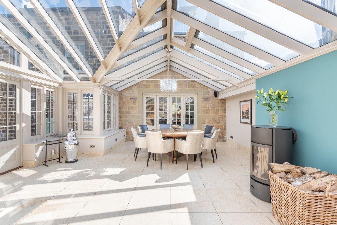 The open plan kitchen dining area is the hub of the house incorporating a spacious orangery, which extends the dining/living area to the guest wing and enhances natural light levels. In addition to this the main house has two generous reception rooms overlooking the gardens, currently used as a drawing room with bar area and a formal dining room. The hallway has a beautiful Georgian staircase and ornate plasterwork mentioned in the listing text. There is a useful utility/ cloakroom in this part of the property as well as the arched wine cellar.
