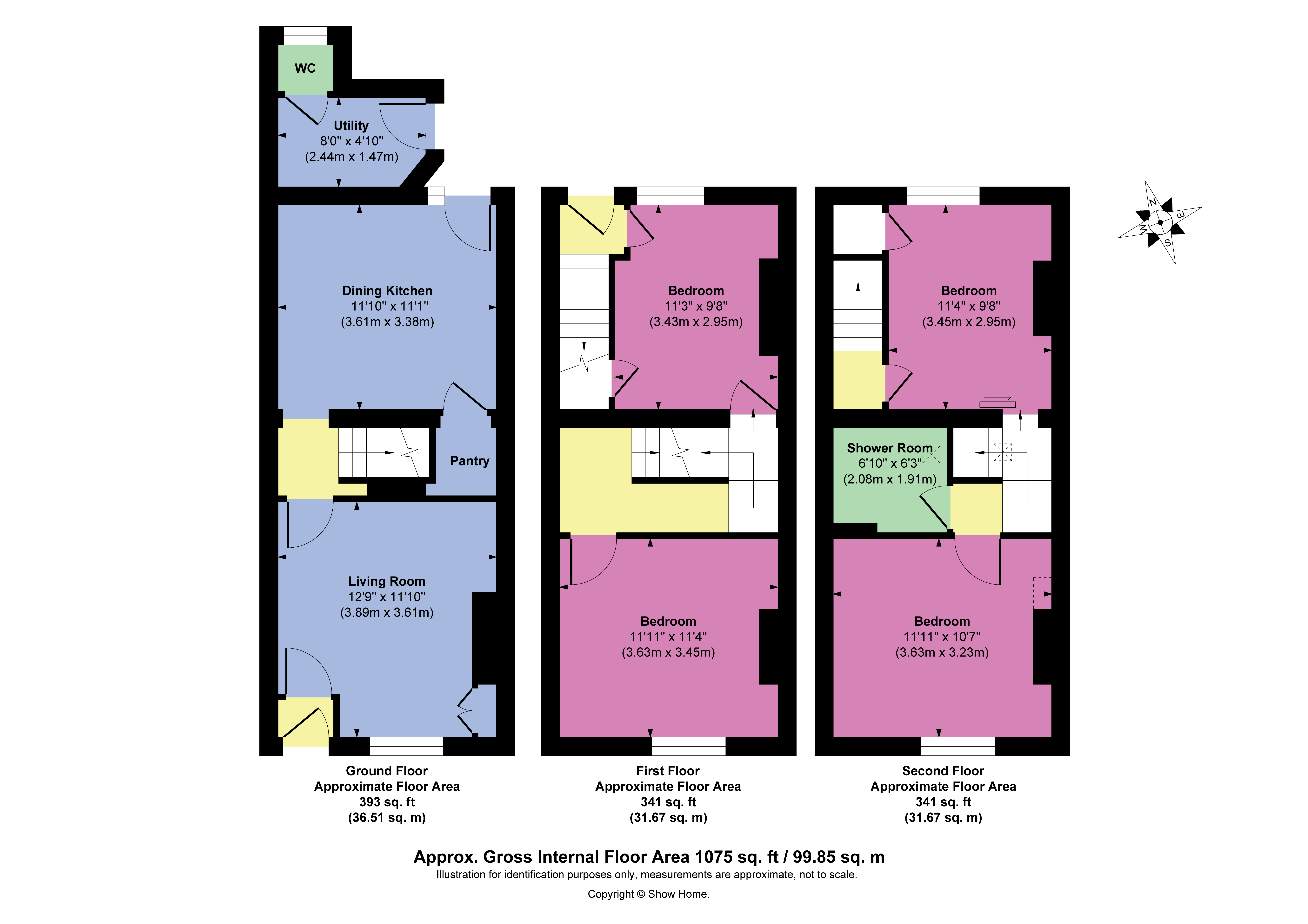 Set across three floors, the property opens with a welcoming sitting room at the front, where a large sash window fills the space with natural light. To the rear, the well-planned kitchen is fitted with modern cabinetry and integrated appliances, with a useful walk-in pantry providing additional storage. From here there is access to a convenient cloakroom with WC and basin, as well as a door leading to the garden.