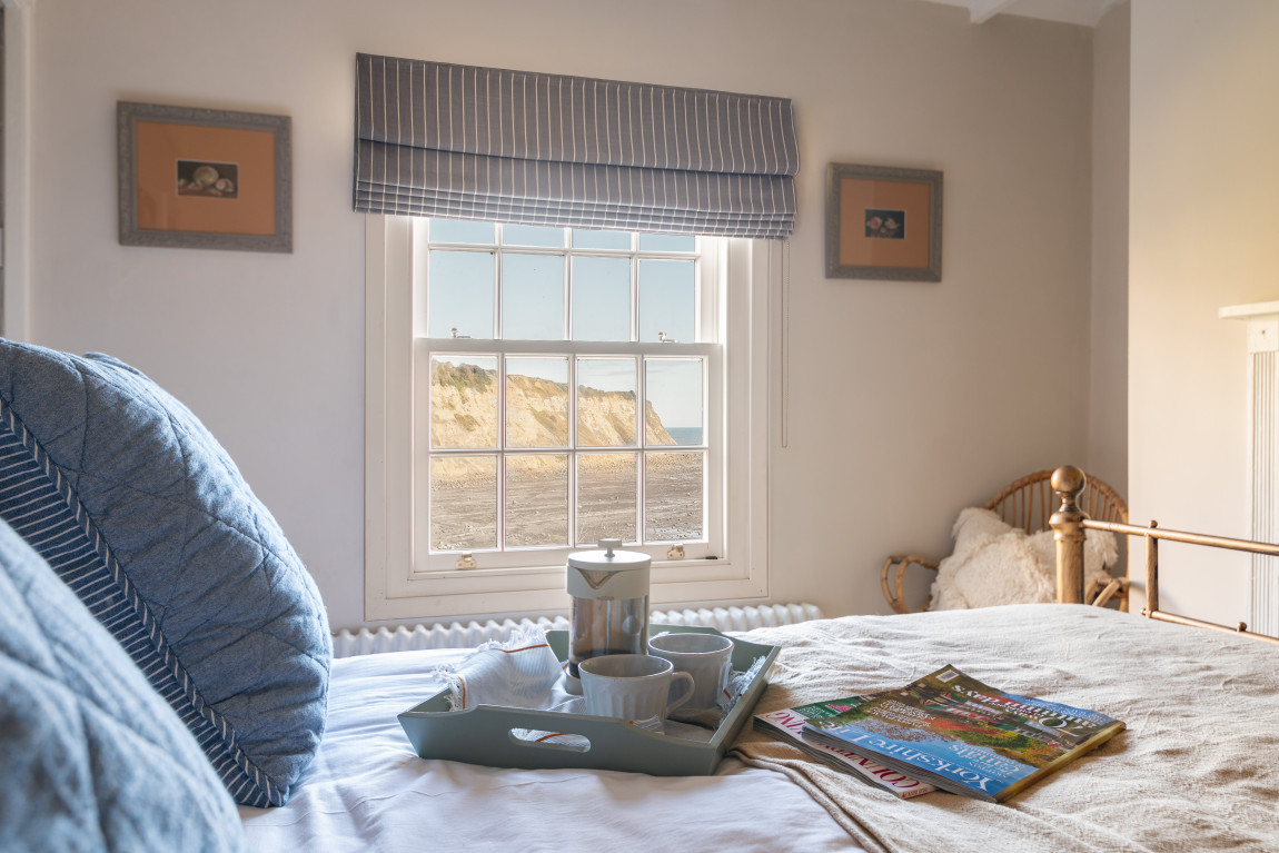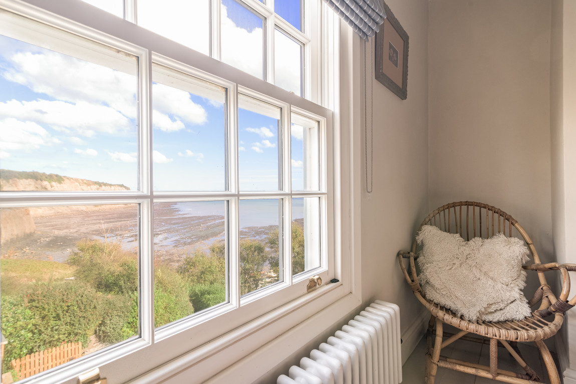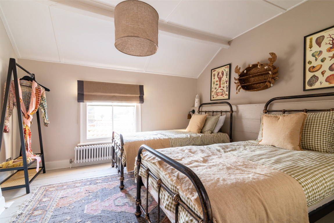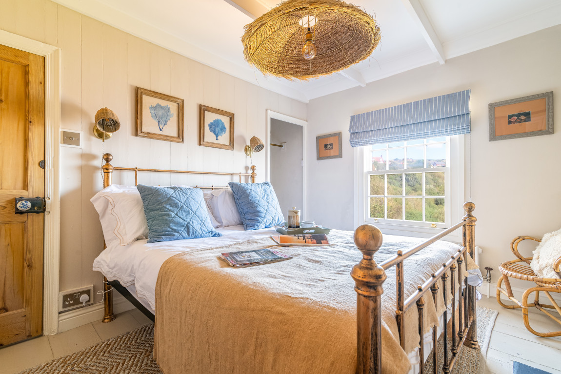 On the first floor a second sitting room takes full advantage of panoramic views across the bay, while a generous bedroom, currently arranged with a super-king bed, features a vanity basin and dedicated wardrobe space. The top floor is home to two further bedrooms, each with its own character and outlook. One is arranged as a spacious twin with warm coastal detailing, while the other captures the most dramatic views across the sea and coastline, making it a truly memorable room.