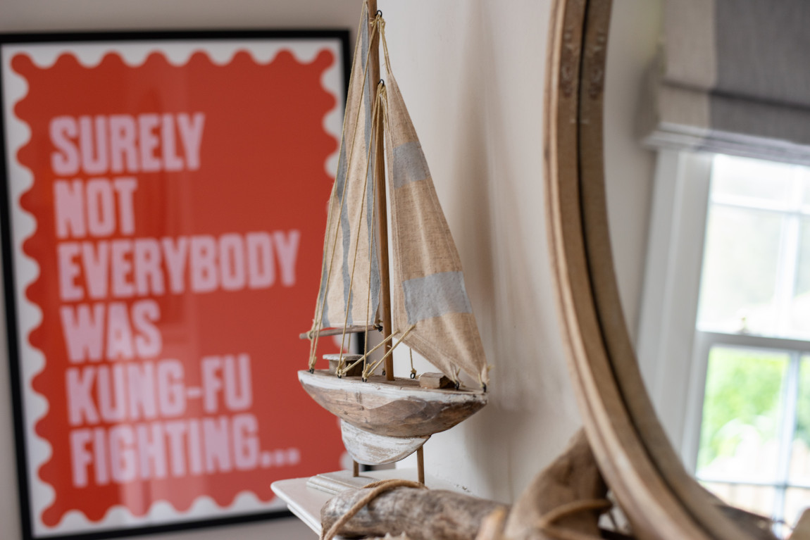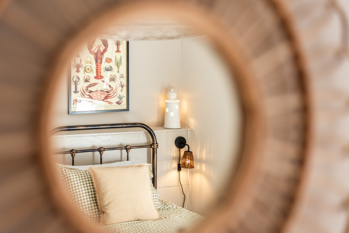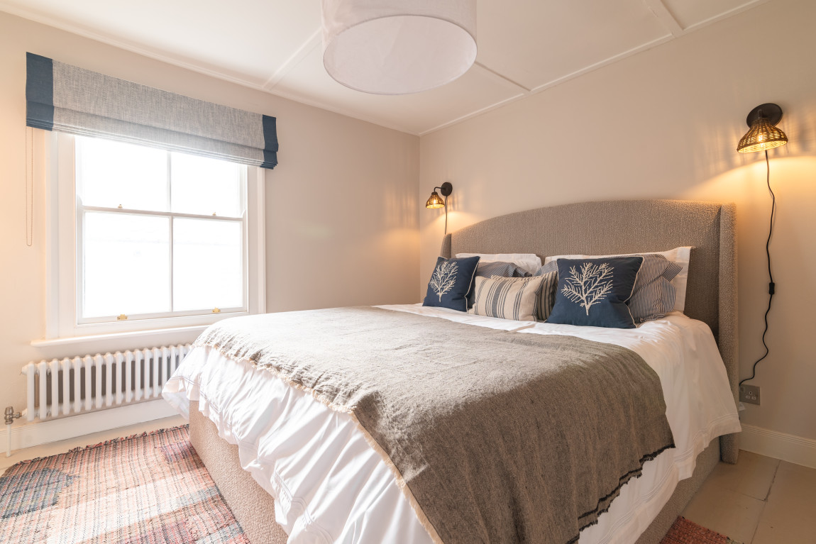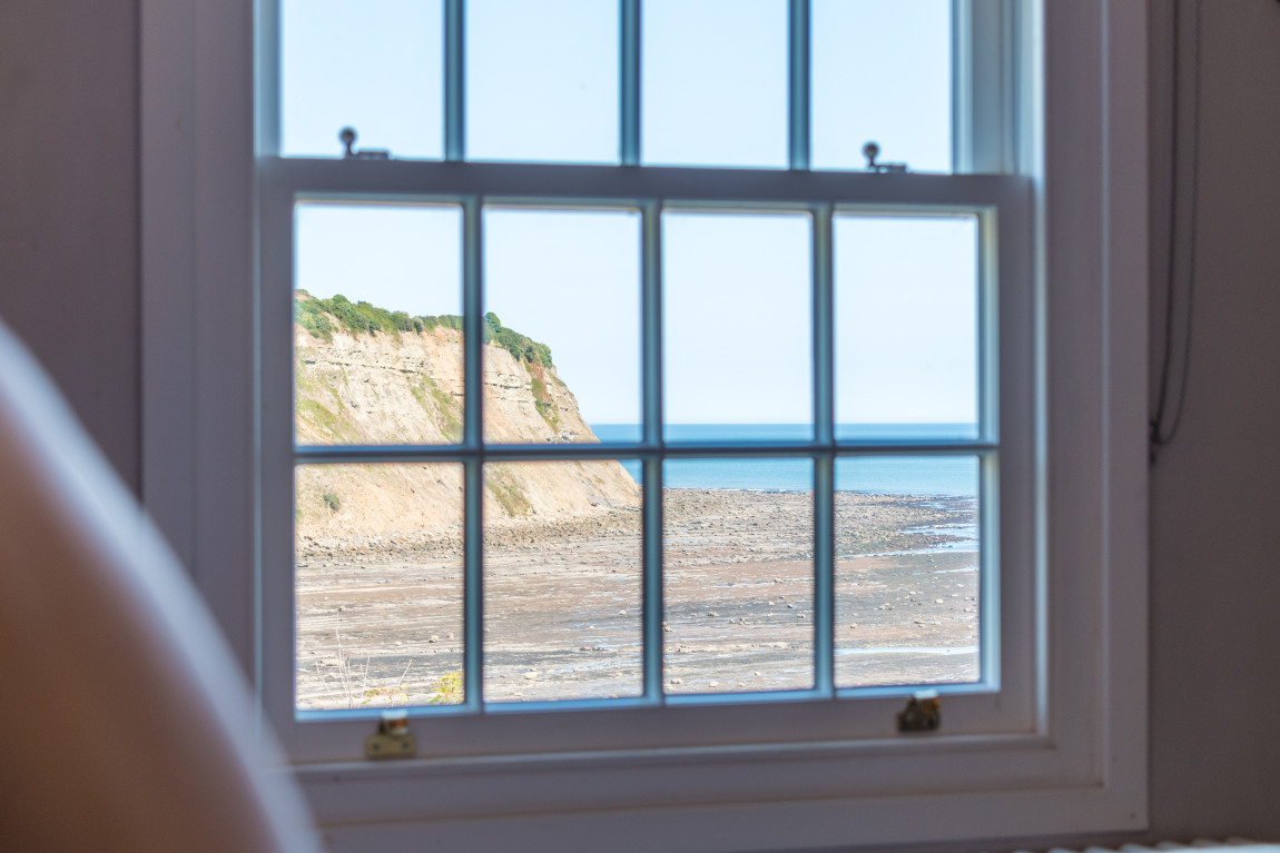 On the first floor a second sitting room takes full advantage of panoramic views across the bay, while a generous bedroom, currently arranged with a super-king bed, features a vanity basin and dedicated wardrobe space. The top floor is home to two further bedrooms, each with its own character and outlook. One is arranged as a spacious twin with warm coastal detailing, while the other captures the most dramatic views across the sea and coastline, making it a truly memorable room.