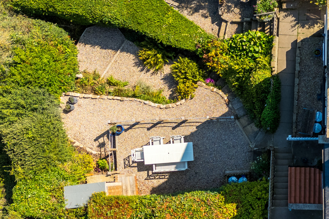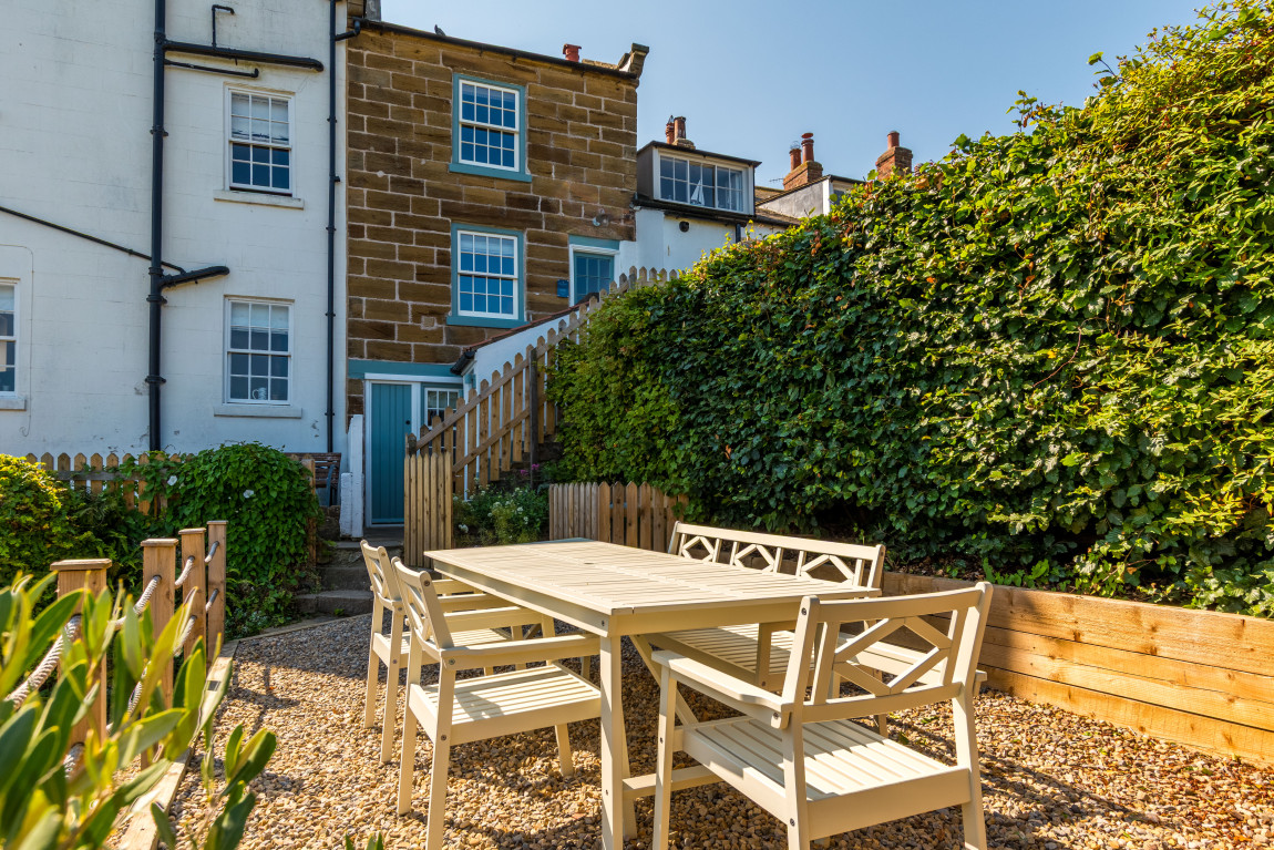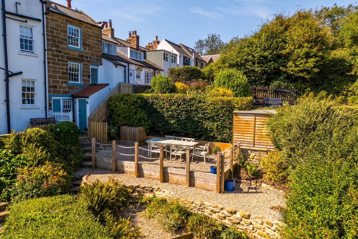Outside, the property enjoys a terraced garden, a rare find in Robin Hood’s Bay. Landscaped to make the most of its elevated position, it offers outstanding sea views and a generous seating area, creating a unique coastal retreat.