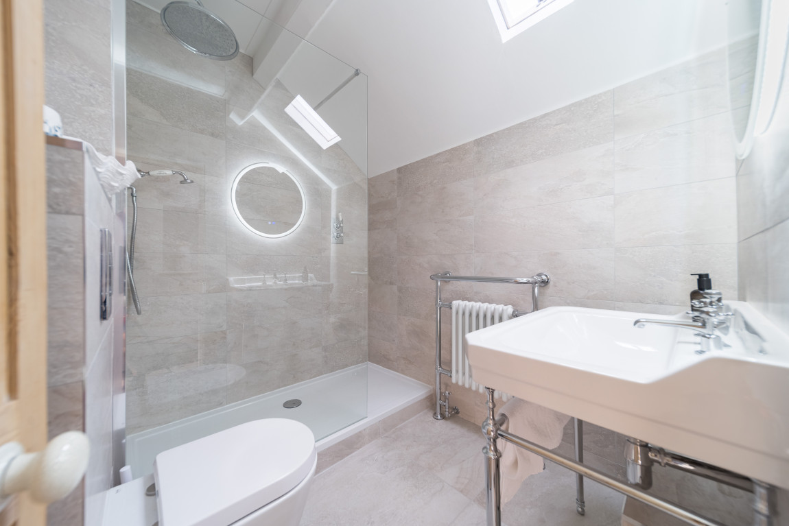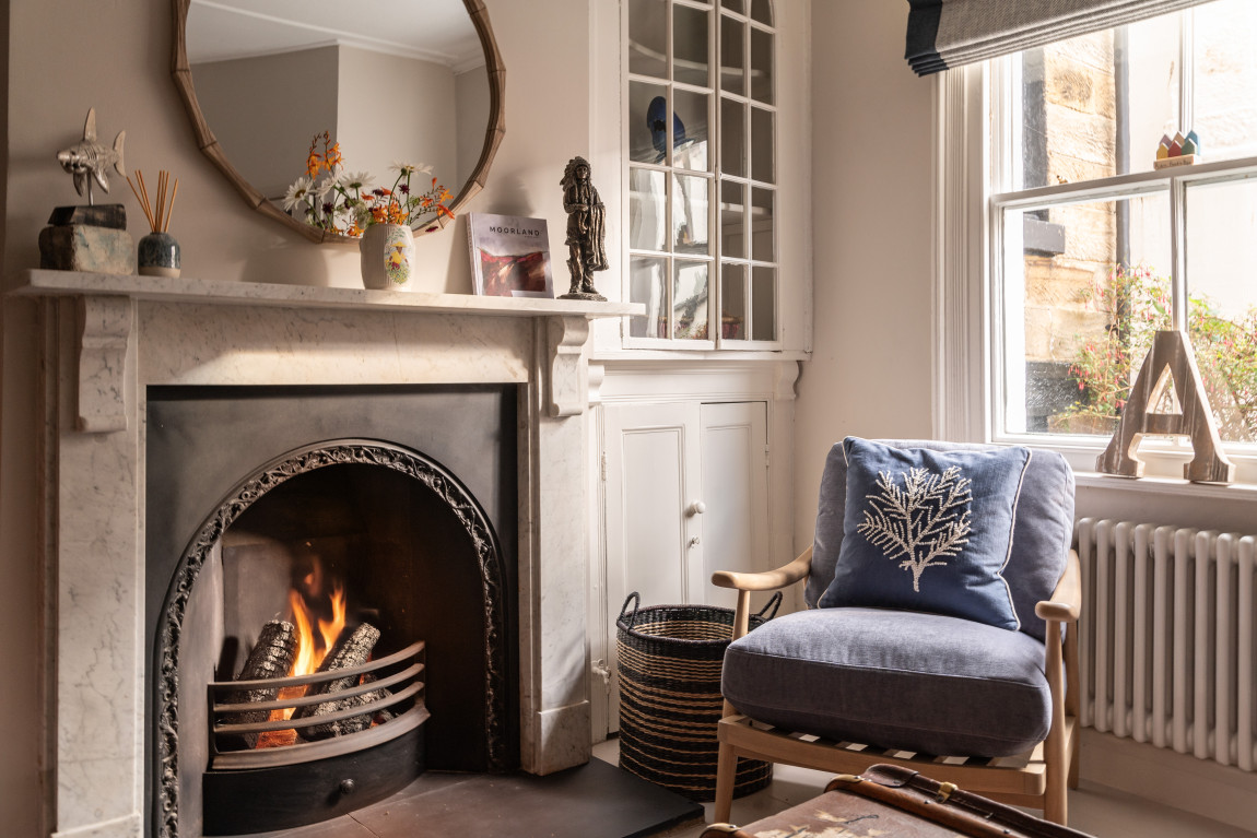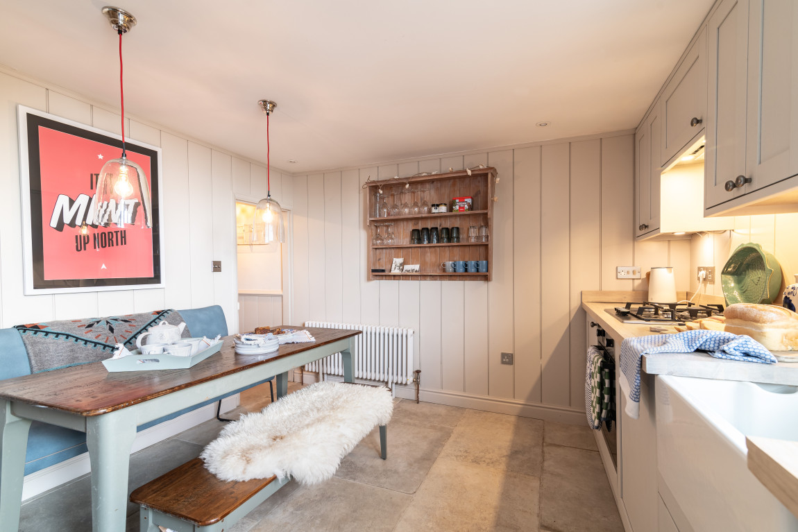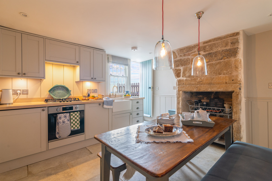 Outside, the property enjoys a terraced garden, a rare find in Robin Hood’s Bay. Landscaped to make the most of its elevated position, it offers outstanding sea views and a generous seating area, creating a unique coastal retreat.