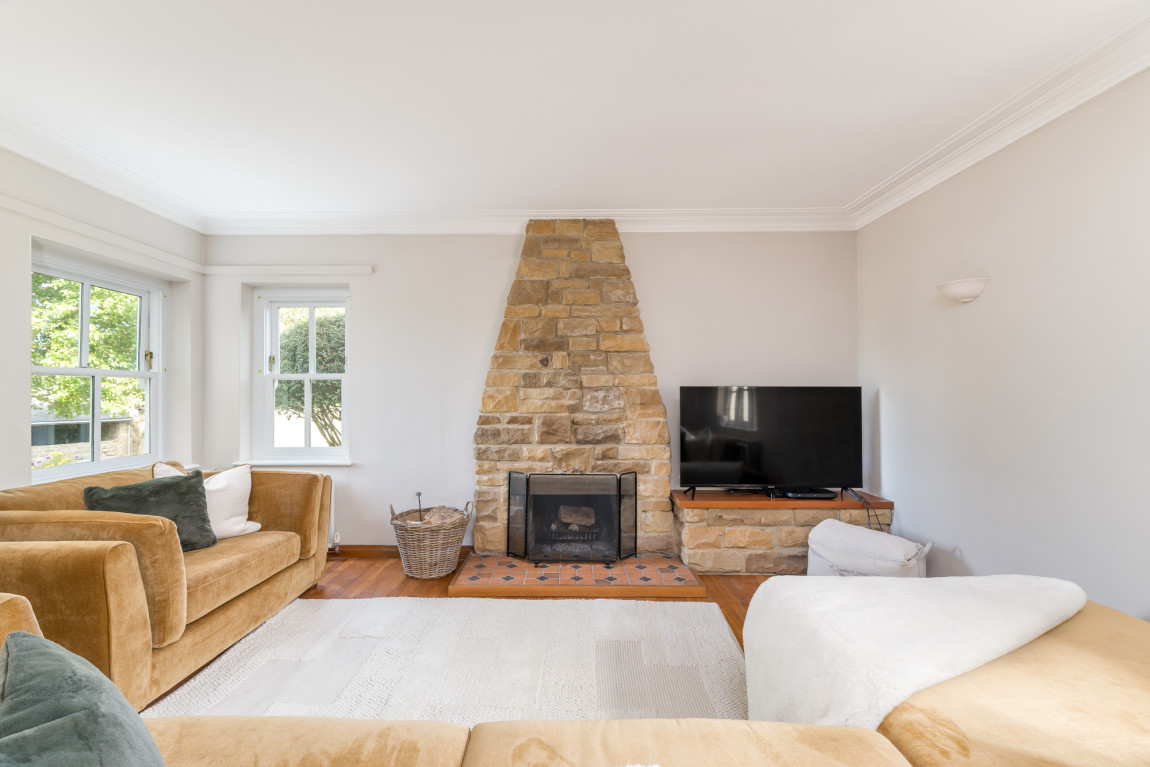 The ground floor features multiple access points, with the main northern entrance opening into a practical boot room and cloakroom. This leads seamlessly to a magnificent triple-aspect drawing room complete with working fireplace, and then through to a traditional kitchen featuring bespoke cabinetry, generous dining space, and cozy seating nook overlooking the front garden. The flow continues through a comfortable second sitting room retaining its original fireplace, past an impressive hallway showcasing a striking tall Georgian-style window and elegant staircase, culminating in a living room or formal dining room with feature fireplace. A second northern entrance with porch area sits conveniently near the kitchen and is currently utilized for log storage and boot store.