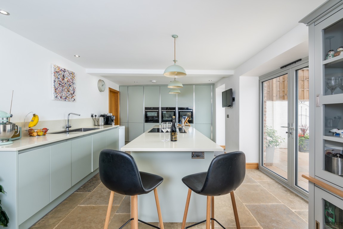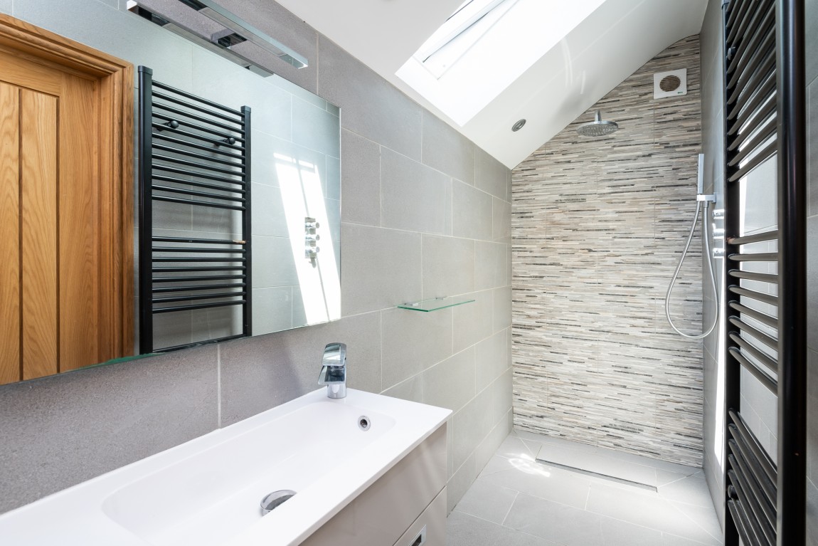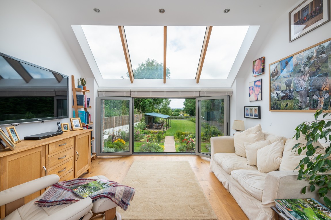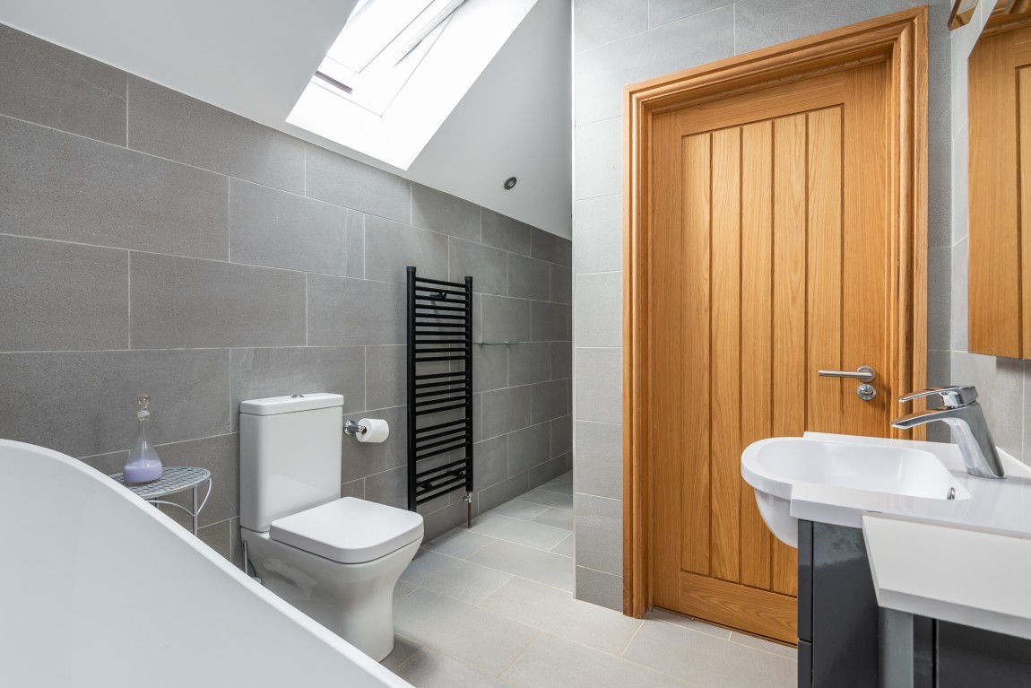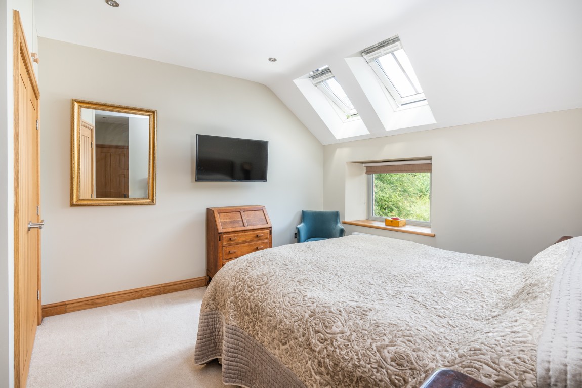 Located upstairs, via the bespoke oak staircase, are the three double bedrooms and the second living space. The second living room has French doors opening onto a Juliette balcony, again making the most of the amazing views and drawing the eye to the open fields.