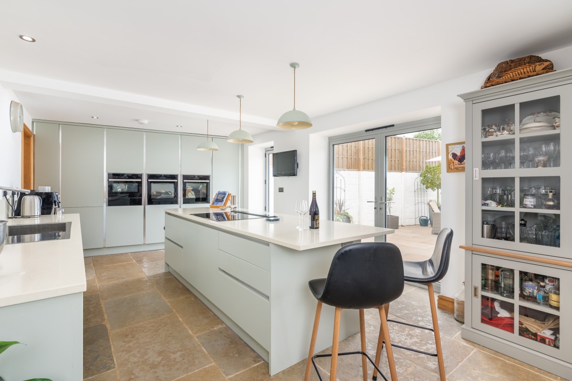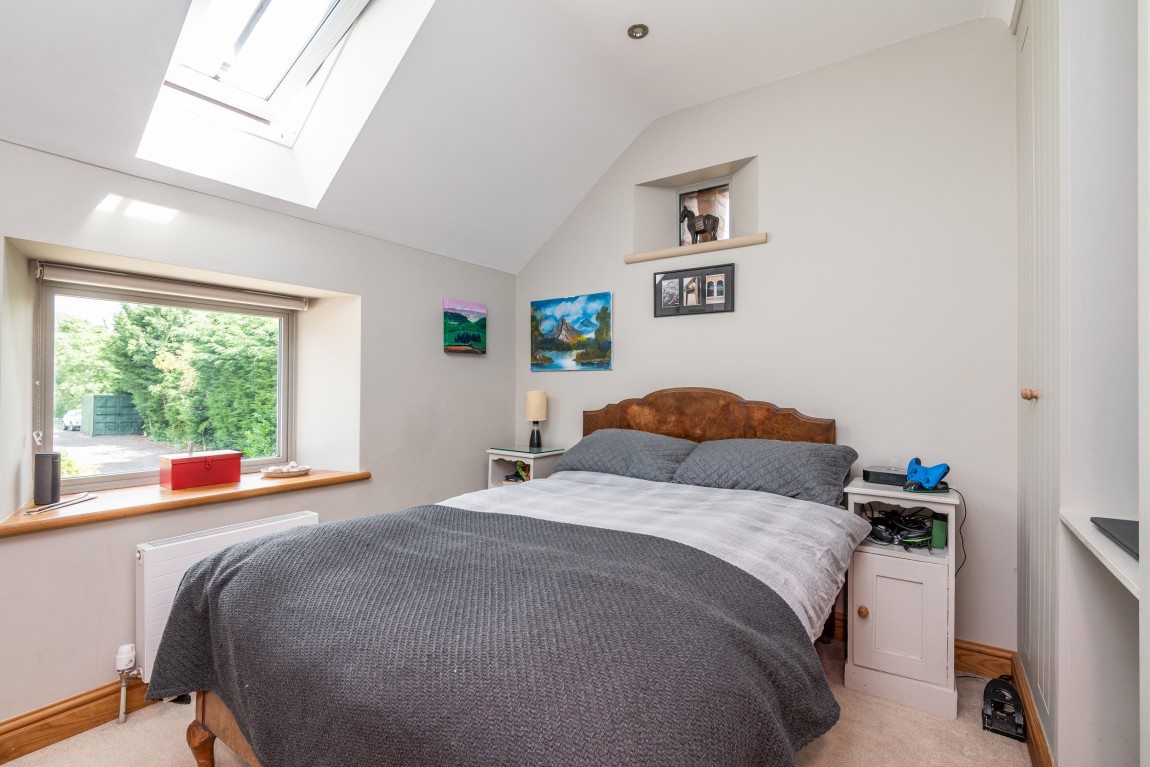The kitchen is open to the dining space, study area and the sitting room with gas log-effect built in wall fire. The living space is a perfect relaxation area with uninterrupted views over the garden and the rolling countryside beyond.