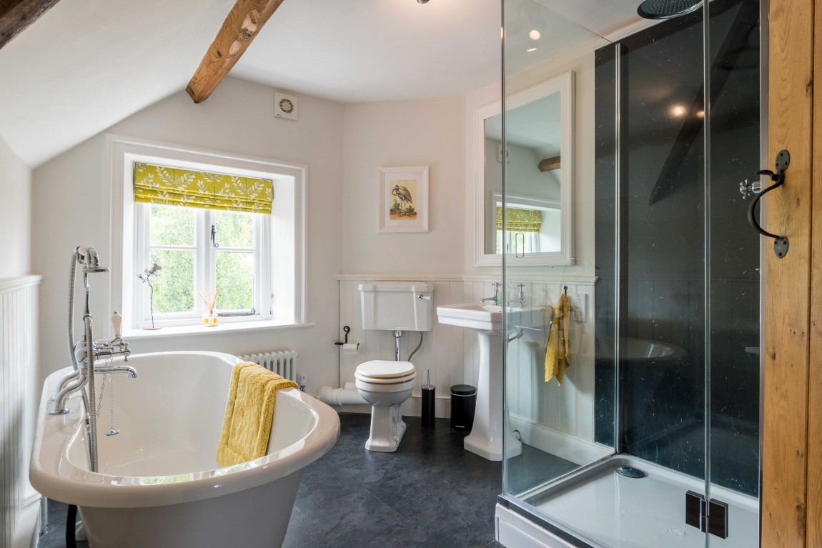 Upstairs there are two good sized double bedrooms and a stunning bathroom with a freestanding bath – to ‘soak’ up views of the garden and large walk-in shower.