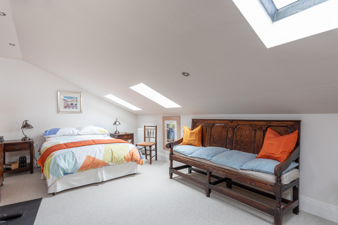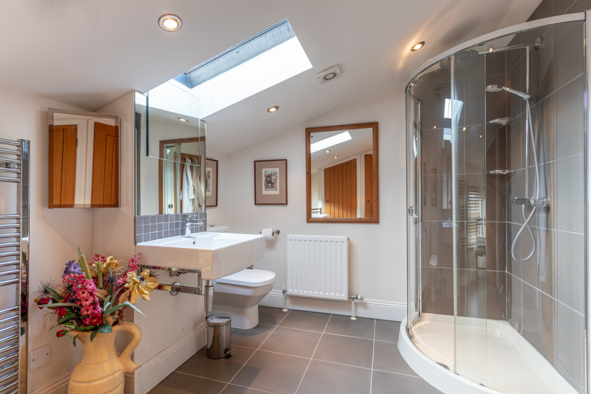 The first floor accommodation is accessed by an oak staircase with built in low level lights. The principal bedroom is bright and light with a large ensuite bathroom and separate shower. There are two additional generously sized double bedrooms with ensuites. There is also a house shower room. Sanitaryware is by Villeroy and Boch and tiles by Fired Earth. All ensuites and the house shower room have independently heated towel rails and underfloor heating.
