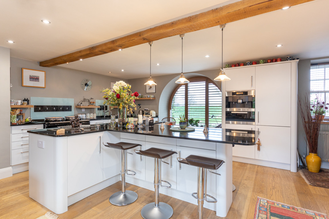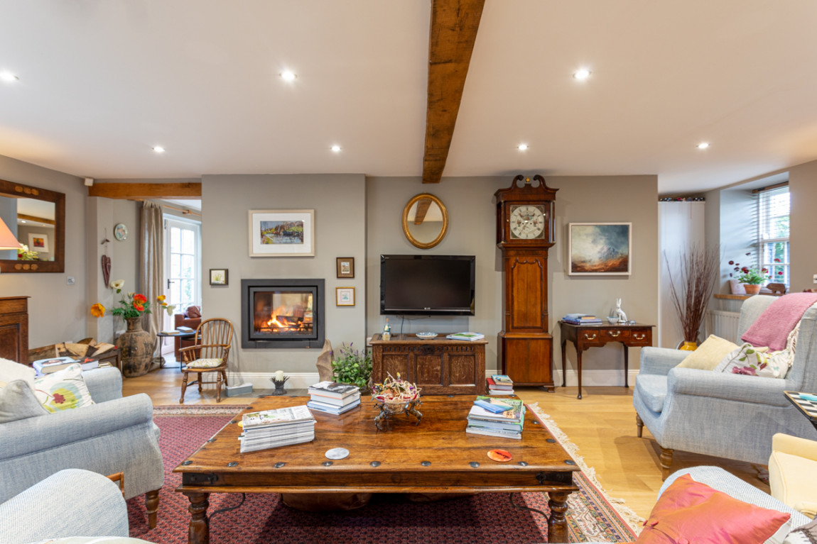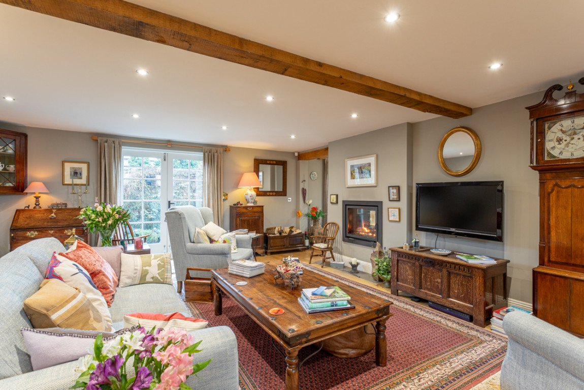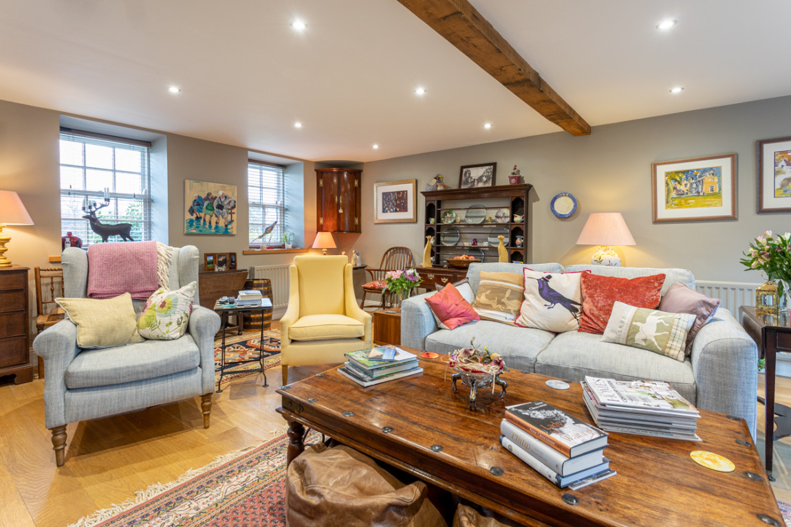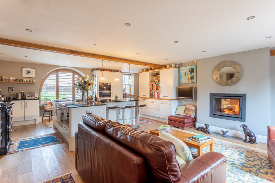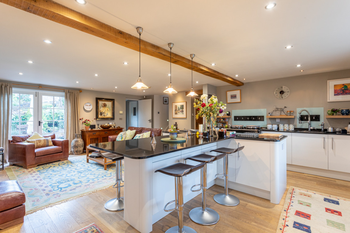 The clever design of the open plan space runs seamlessly into the elegant and spacious sitting room, with double doors leading to the pretty walled garden.