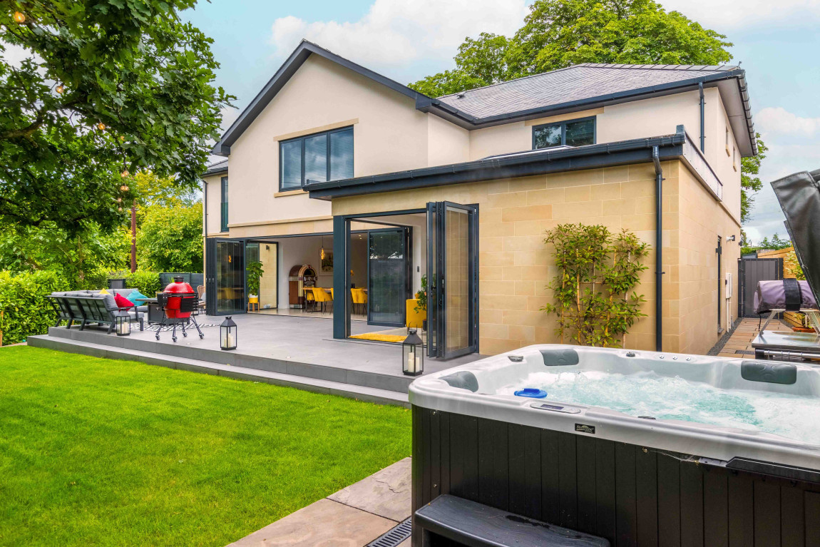 Outside, the property has been beautifully landscaped with private gardens to the front and rear. The front garden in particular is extremely private and gets plenty of sunshine. The lawned area is surrounded by well established planting and borders and is great for those who like a ‘low maintenance’ garden. It is also lit, so is great for evening entertaining alfresco. The current vendors have also added a hot tub to the side and a garden house.