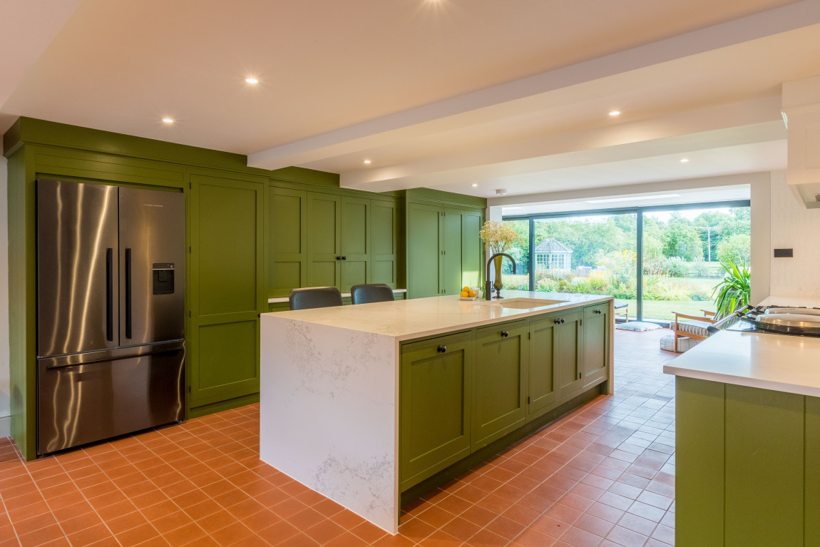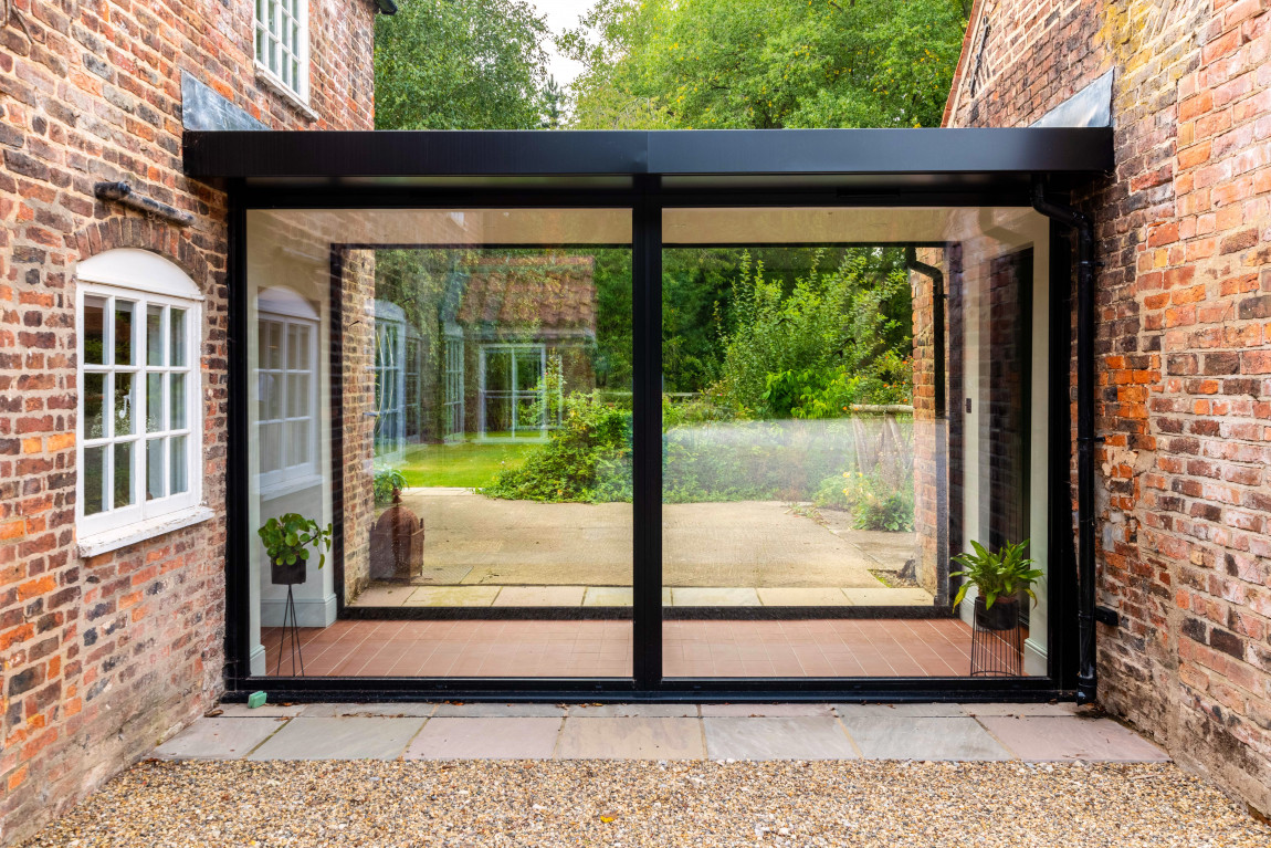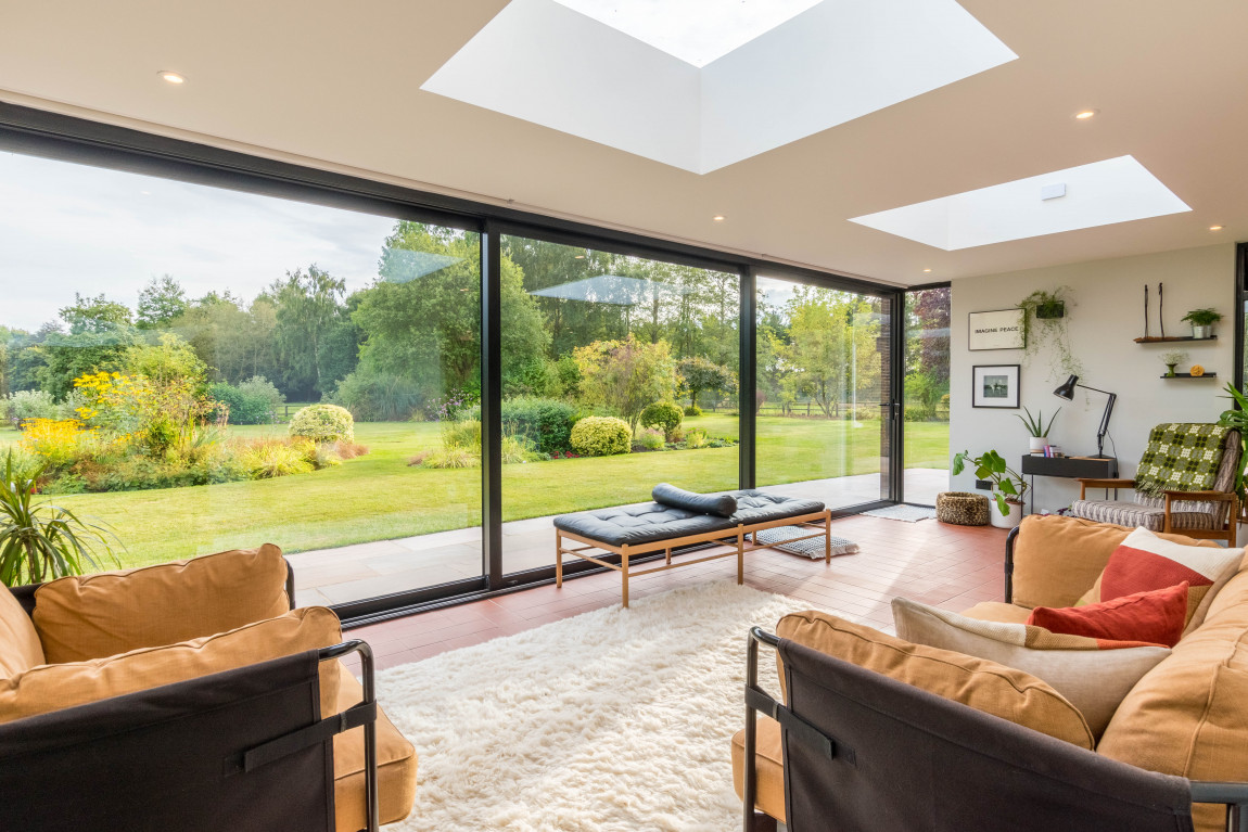 The main house has a gross internal floor area of approximately 5000 sq ft and the hub is a beautiful bespoke kitchen with large central island, AGA, plenty of storage and Miele and Fisher and Paykel appliances. To one end of the kitchen is a large dining area with log burner and to the other the current vendors have added a fabulous architect designed garden room which gives panoramic views of the grounds and opens out on to a wrap around south facing terrace – perfect for entertaining or relaxing.