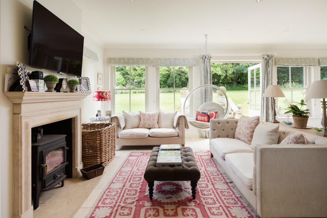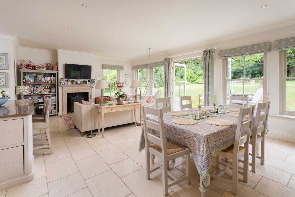 • Exceptional kitchen/dining/living room of generous proportions lined with magnificent double-glazed windows and French doors that open into the garden. There is underfloor heating, a bespoke fitted kitchen from The Main Furniture Company, Marble Arts granite worktops, an oil-fired Aga and wood-burning stove. A large boot room and utility room with stable door and walk-in pantry.