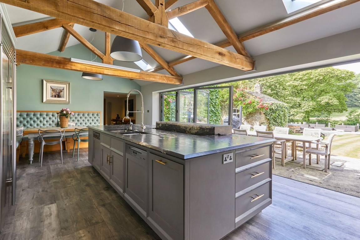Once inside the house one quickly sees the fantastic blend of old and new the house offers. The overall presentation of the house is first class, the principal reception rooms face South and through the mullioned windows are views down the garden. The hub of the house though is the beautiful state of the art living kitchen, which was added by the current vendor, with bi-folding doors that open out on to a West facing terrace and look out over rolling countryside. It is the perfect of example of bringing the outdoors inside!